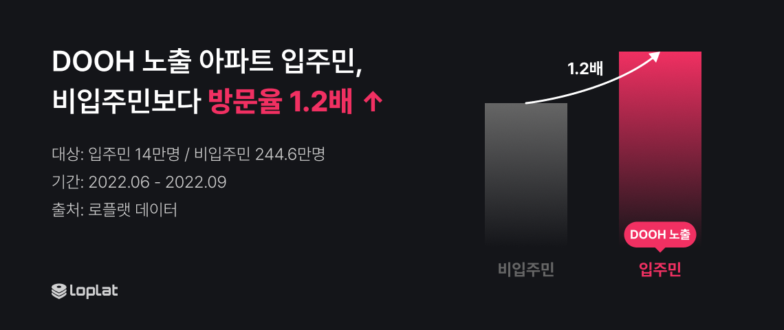 예를 들어 포커스미디어의 캠페인 분석 결과, 롯데마트 광고가 노출된 아파트 입주민은 비입주민보다 롯데마트 방문율이 1.2배 높았습니다. |