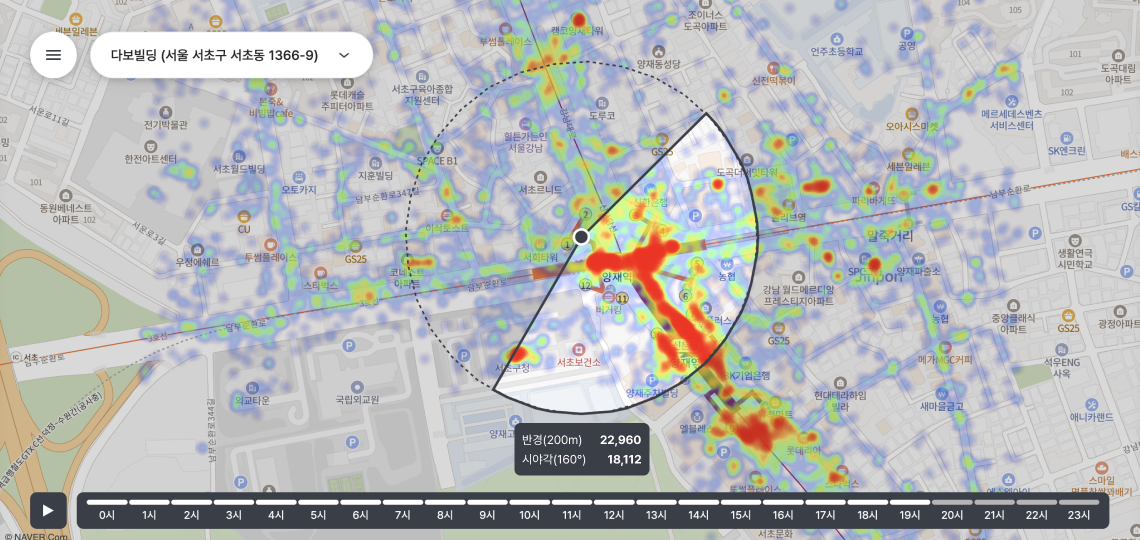 디지털 옥외광고판에서 실제 광고가 노출되는 영역을 폴리곤 형태로 정밀하게 설정합니다. 그리고 GPS, Wi-Fi, BLE 신호 등으로 해석한 데이터를 활용하여 노출 인구를 추출합니다. |