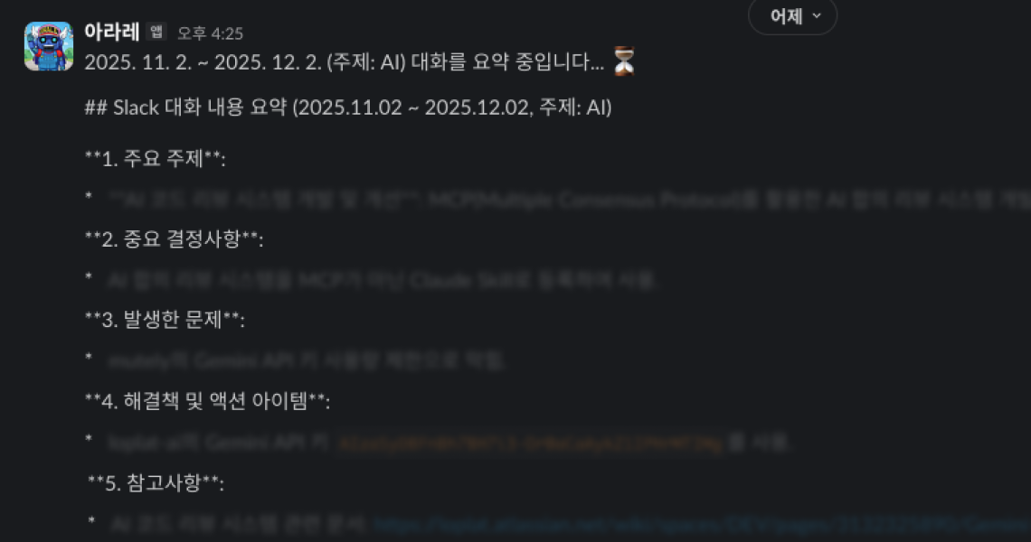 아라레는 슬랙에서 '요약 3일전', '요약 2025-01-02' 처럼 기간을 지정하거나, 특정 주제를 입력하면 해당 범위의 대화를 읽고 핵심만 빠르게 정리해줍니다. |