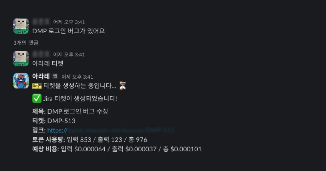 또, 슬랙에서 '@아라레 + 티켓'를 호출하면 대화 내용을 분석해 버그·작업·시나리오 등을 파악하고, 적절한 프로젝트를 자동으로 설정해 Jira 티켓을 생성해줍니다. |