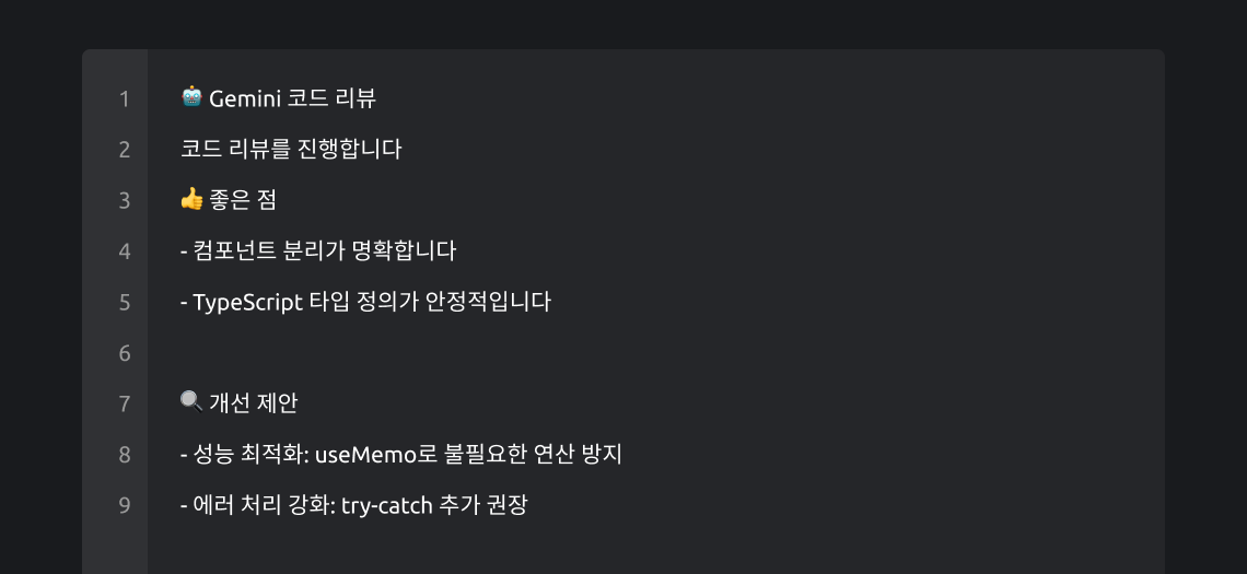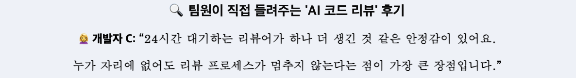 AI는 전체 변경사항을 요약하고, 필요한 경우 특정 라인에 피드백을 남겨주어 개발자가 놓칠 수 있는 부분을 빠르게 확인할 수 있습니다. |