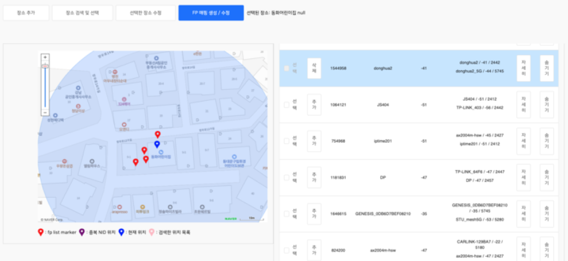 하지만 실제 현장에서는 한 장소 주변에 수십~수백 개의 와이파이 이름이 동시에 잡히기 때문에, 이 중 실제로 장소와 연관된 데이터를 사람이 일일이 골라내야 하는 어려움이 있었습니다. |